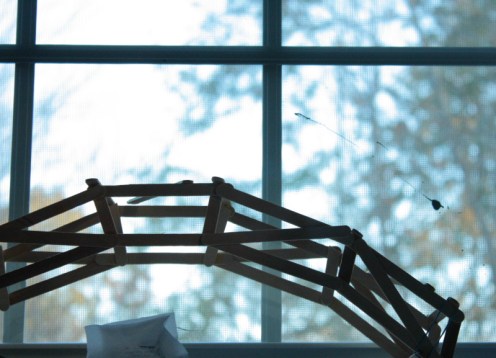 T made this bridge last year for cub scouts and I spotted it in the window on my way up the stairs this morning and it seemed potent, when I had a moment to think about it. A strong bridge made of skinny sticks to symbolize our ongoing arch toward the future. Or something. Delicate things like this bridge usually break in our household of blousey ruckusing, but this bridge has lasted for almost a year. Practically a miracle.